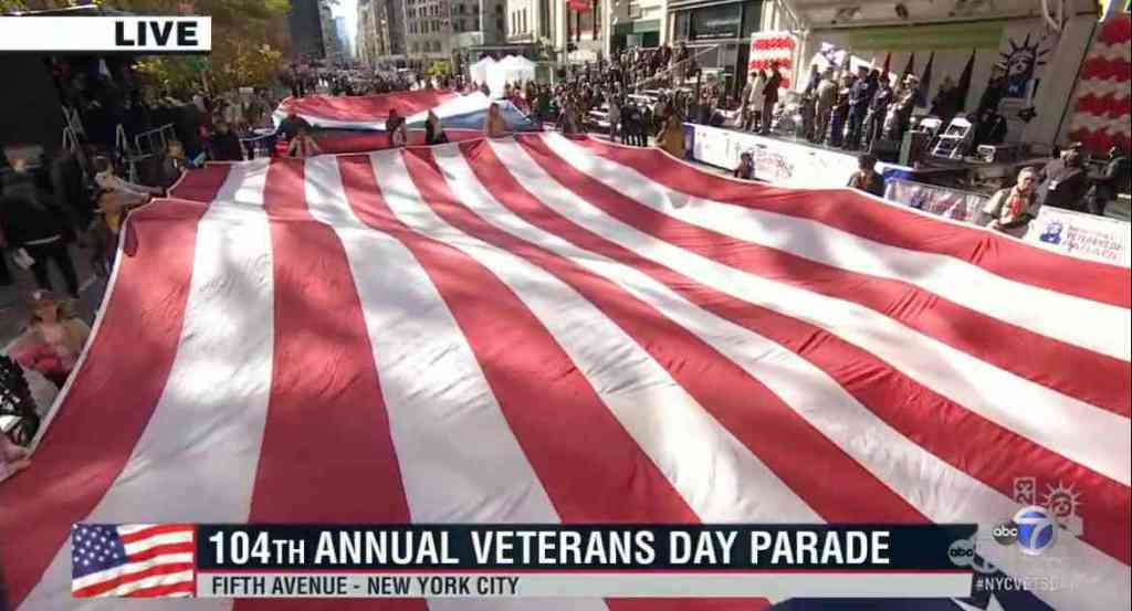Troop 1 on TV helping carry a huge flag, Veterans Day Parade 2023